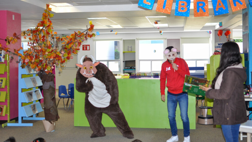 Entre sus proyectos favoritos menciona la Library Week, particularmente el año en que presentaron pequeñas obras de teatro. Para él, fue una experiencia mágica ver la alegría y sorpresa de los niños al descubrirlos detrás de los personajes.