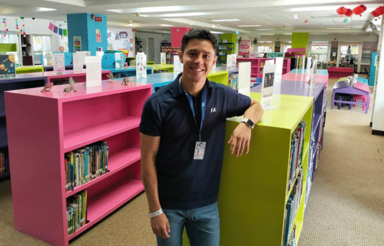 Entre sus proyectos favoritos menciona la Library Week, particularmente el año en que presentaron pequeñas obras de teatro. Para él, fue una experiencia mágica ver la alegría y sorpresa de los niños al descubrirlos detrás de los personajes.